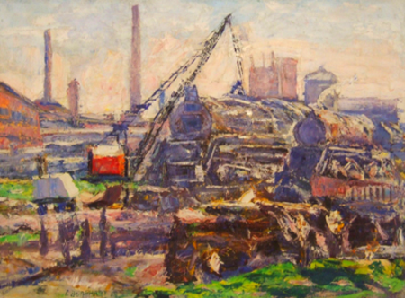 His paintings of grand, still-operable steam-powered locomotives being cast aside, torched, and dismantled to pave the way for diesel engines reflected his literal observation and were emblematic of the broader trend he saw.