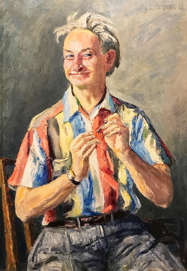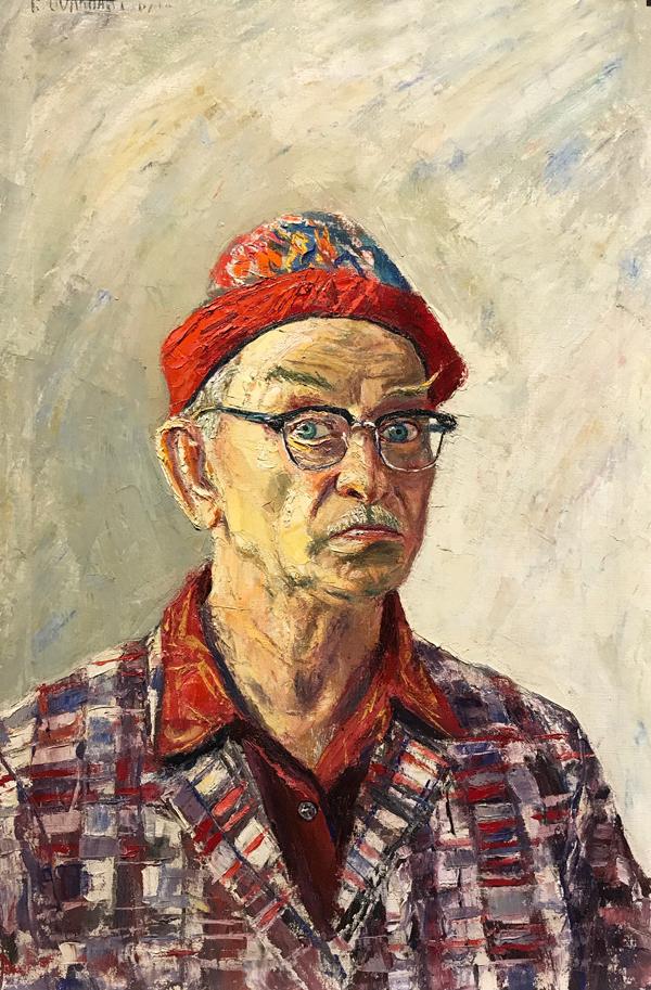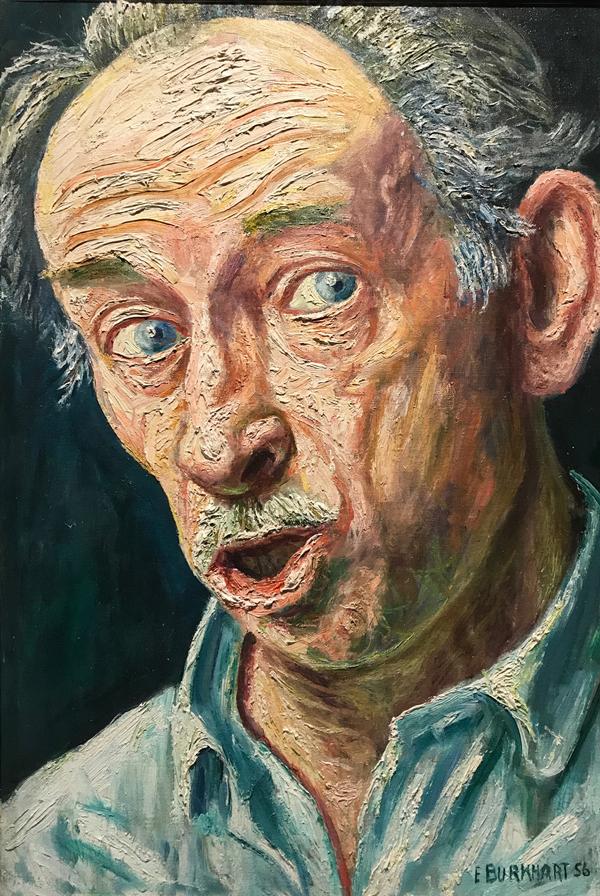 This is one of the few self-portraits Burkhart painted with other elements included in the work. We estimate this example was painted around 1960.
