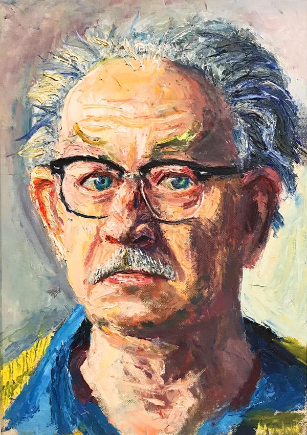 While in Poland on the ISA Trip of 1966, Burkhart had time to render several self-portraits. This and a smaller version, while wearing the same shirt, were the two best he produced that year. Burkhart does a great job of capturing his impish but sincere personality in this version of his many self-portraits. This may be one of the best available on the market today at this price.