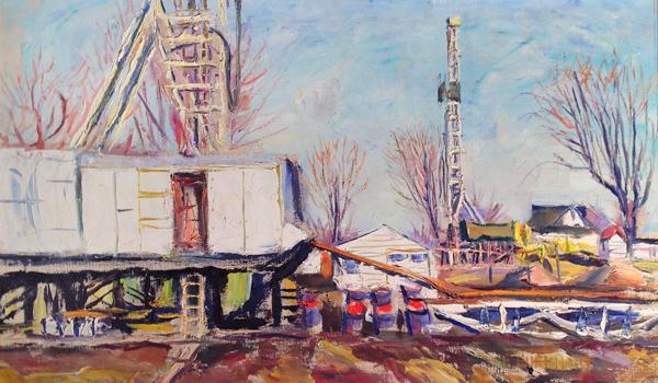 Ohio was ground zero for the oil and gas boom of the 1960’s. Many wells were drilled relatively close to Columbus, and Burkhart made it his business to paint several renditions of this subject matter during this period. This is an opportunity to own a work that depicts an important part of Ohio’s economy during the mid-century.