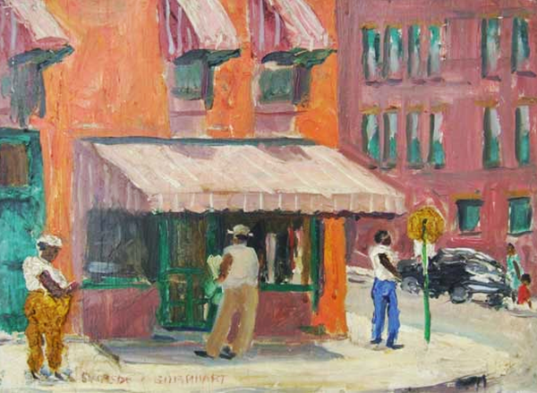 Here is a delightful mid-summer street scene painted by Burkhart in August 1953. The location is noted on the back of the board along with the date. This work is unframed. Very good condition.