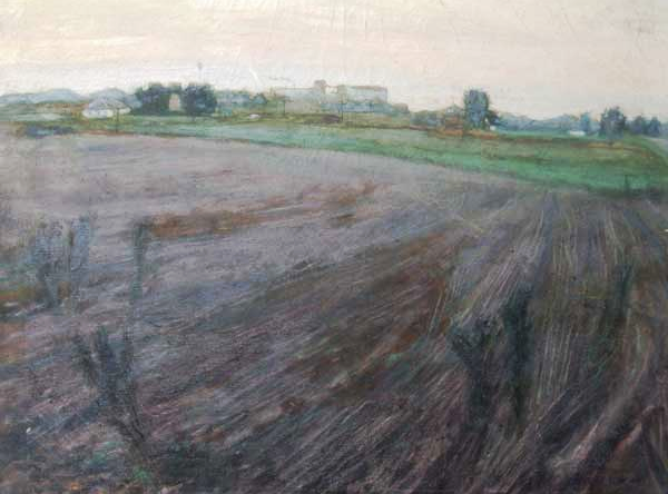 Although farms and landscapes were a staple of Burkhart’s work, this is an interesting example of the field, although the most prominent feature in the painting takes a back stage to the small farming community tucked behind the trees along the horizon. Burkhart invested 16 sessions, as noted by the hash marks he painted on the back of the canvas. It is also inscribed in pencil, August 1, 1943.